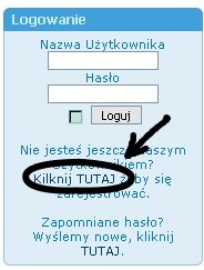 Zwróć uwagę na prawy górny róg ekranu na stronie głównej. Pod dwoma okienkami (LOGIN, HASŁO) jest krótki tekst. W niego jest wpleciony link do zakładania użytkownika (czyli wybrania swojego LOGINA- czyli Imienia pod którym będziesz widziany w serwisie).